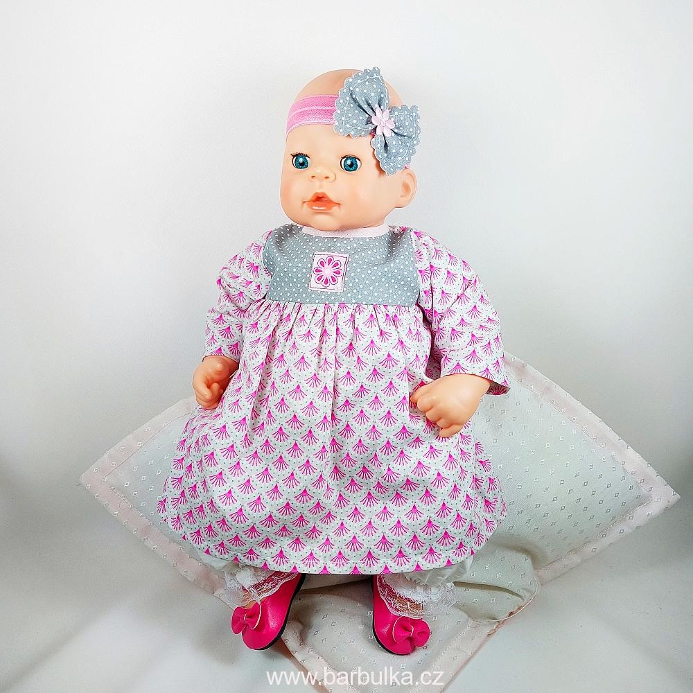 šatičky s dlouhým rukávem, s nášivkou kytičky, materiál bavlna, zapínání vzadu na suchý zip a čelenka, kalhoty s krajkou k tomu nepatří, ale jsou případně k objednání pod číslem 4213