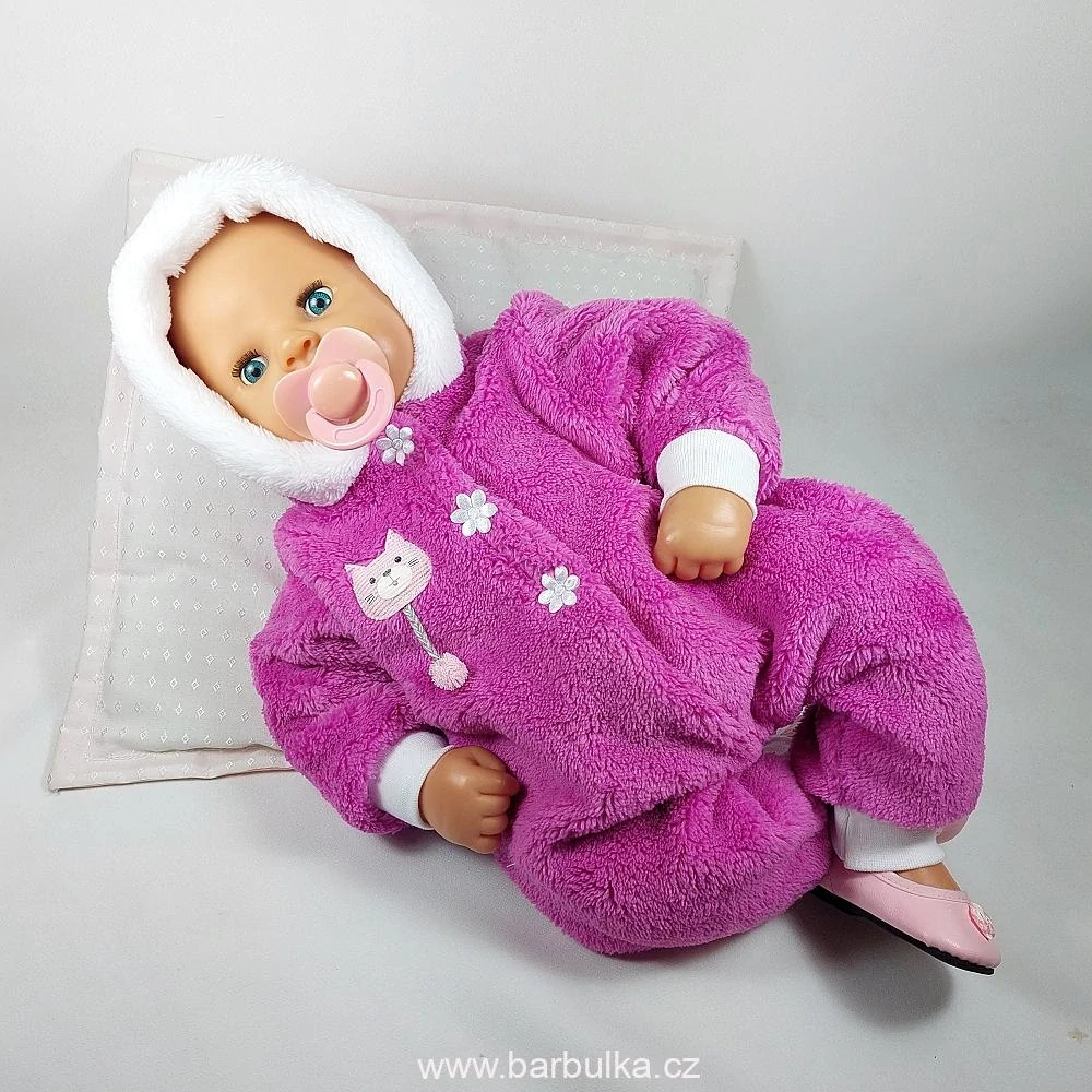 overal s kapucí, z měkoučkého fleecu, s nášivkou kočičiky, rukávky a nohavice do úpletů, zapínání vpředu na neškrabavý suchý zip, knoflíčky jsou jen naznačené