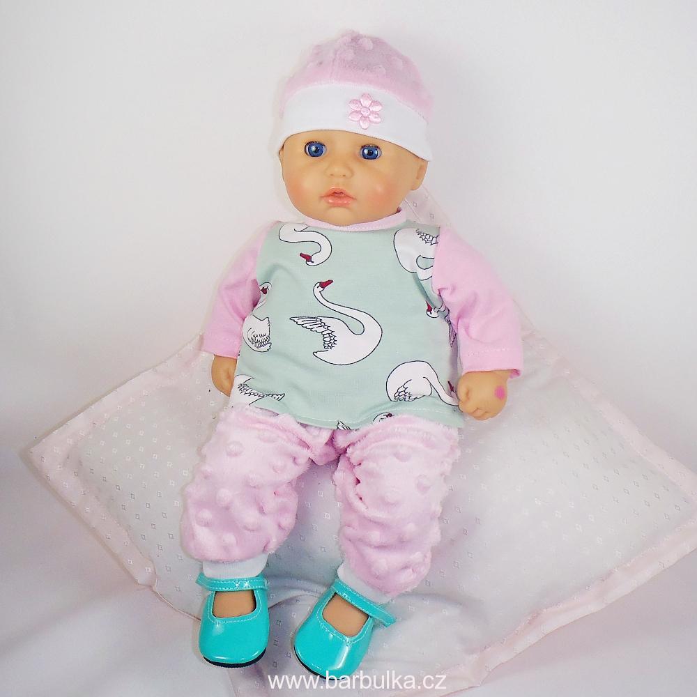 třídílná souprava, tepláčky z minky v pase do gumy, tričko s dlouhým rukávem s labutěmi, zapínání vzadu na suchý zip a čepička, materiál úplet