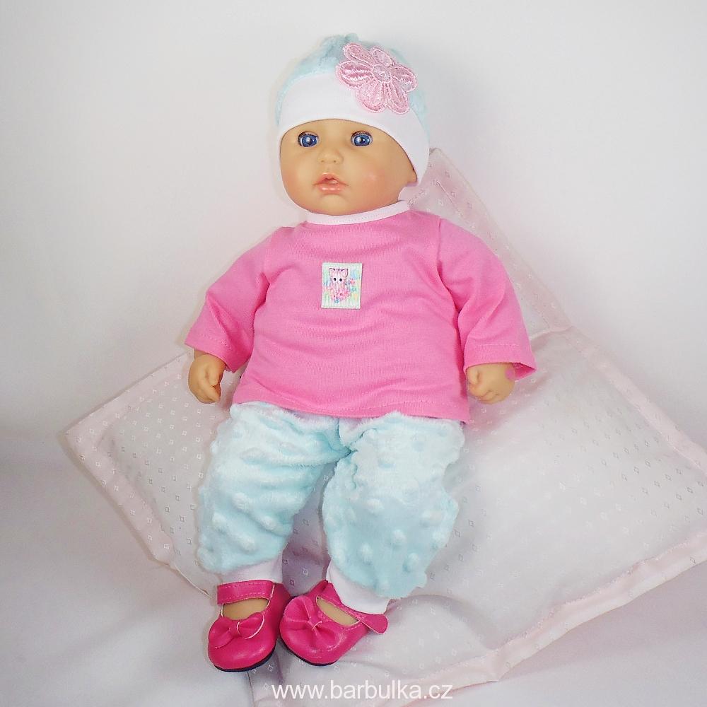 třídílná souprava, tepláčky z minky v pase do gumy, tričko s dlouhým rukávem s nášivkou kočičky, zapínání vzadu na suchý zip a čepička, materiál úplet