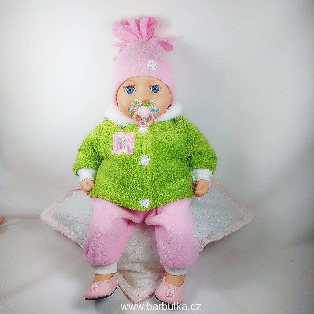 třídílná souprava z fleccu, bundička s kapucí, zapínání vpředu na neškrabavý suchý zip, knoflíčky jsou jen ozdobou, kalhoty v pase do gumy a čepice