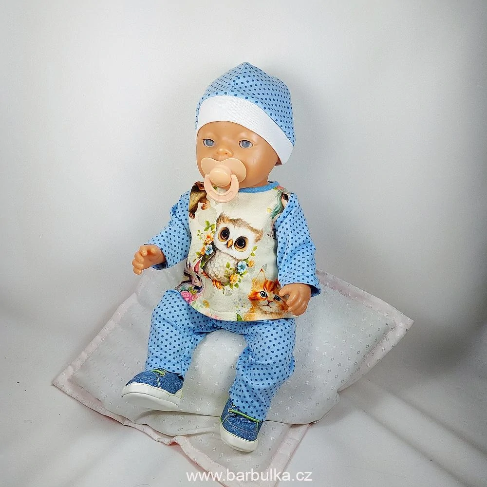 třídílná souprava, tepláčky z minky jsou v pase do gumy, tričko s dlouhým rukávem , zapínání vzadu suchý zip,materiál úplet, a čepička